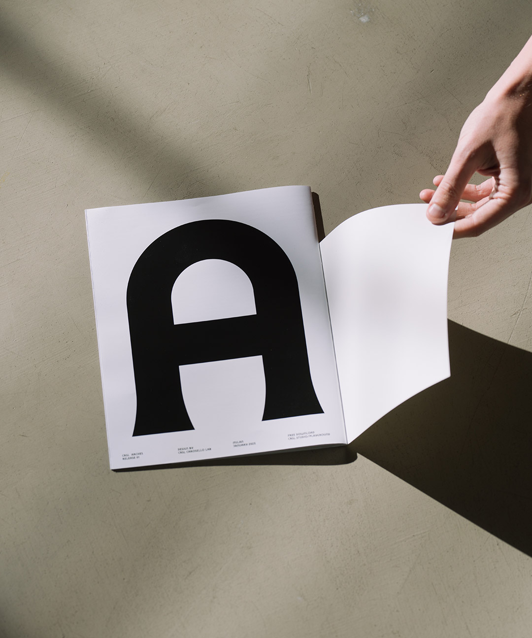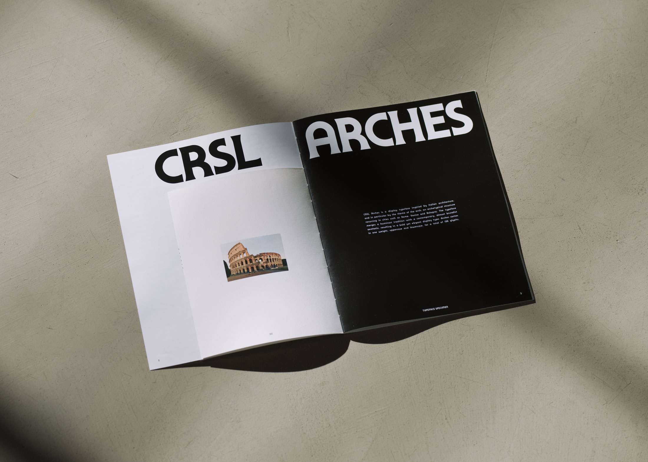 CRSL Arches is a display typeface inspired by Italian architecture, and in particular by the theme of the arch, an archetypical structure recurring in cities such as Rome, Venice and Bologna. The typeface merges a humanist tradition with a contemporary, almost brutalist aesthetic, resulting in a bold yet elegant display type. Arches comes in one weight, uppercase and lowercase, for a total of 196 glyphs.