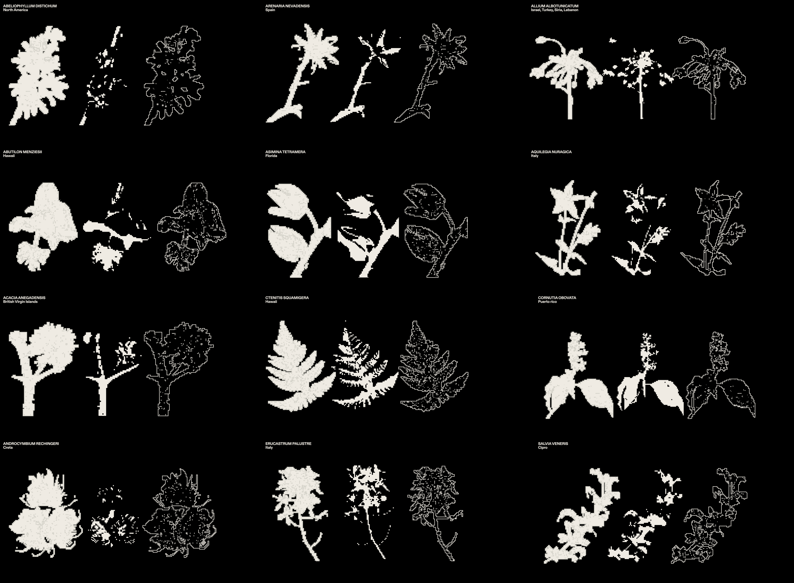 Being struck by such information, we decided to pay homage to these plants by designing a digital bouquet, a romantic attempt to celebrate their forgotten beauty. Of course we did it our way, experimenting in the creation of a unique visual language. We played with the idea of decay and with the ephemeral nature of all things, including digital data. The pixellated look refers to this volatility, and we hope that these illustrations will spark curiosity and wonder about the beauty and diversity of plant life, both past and present.