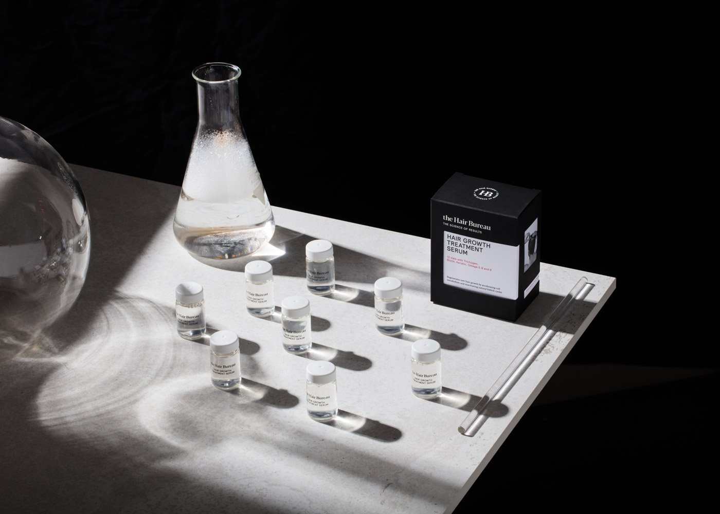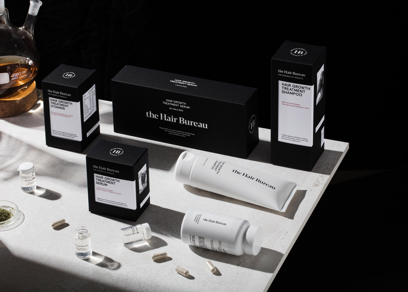 The client came to CRSL in July 2018 with the idea of creating a new men’s haircare brand: they only had the products and a price list. From our research, we envisioned a very scientific brand balanced by a sexy, stylish design. We created the name THE HAIR BUREAU and the payoff “The science of results” and we built the identity around the idea of a laboratory, where scientists work non-stop to find the right combination of ingredients to prevent hair loss. The packaging itself symbolizes an office desk where all research results are arranged together.